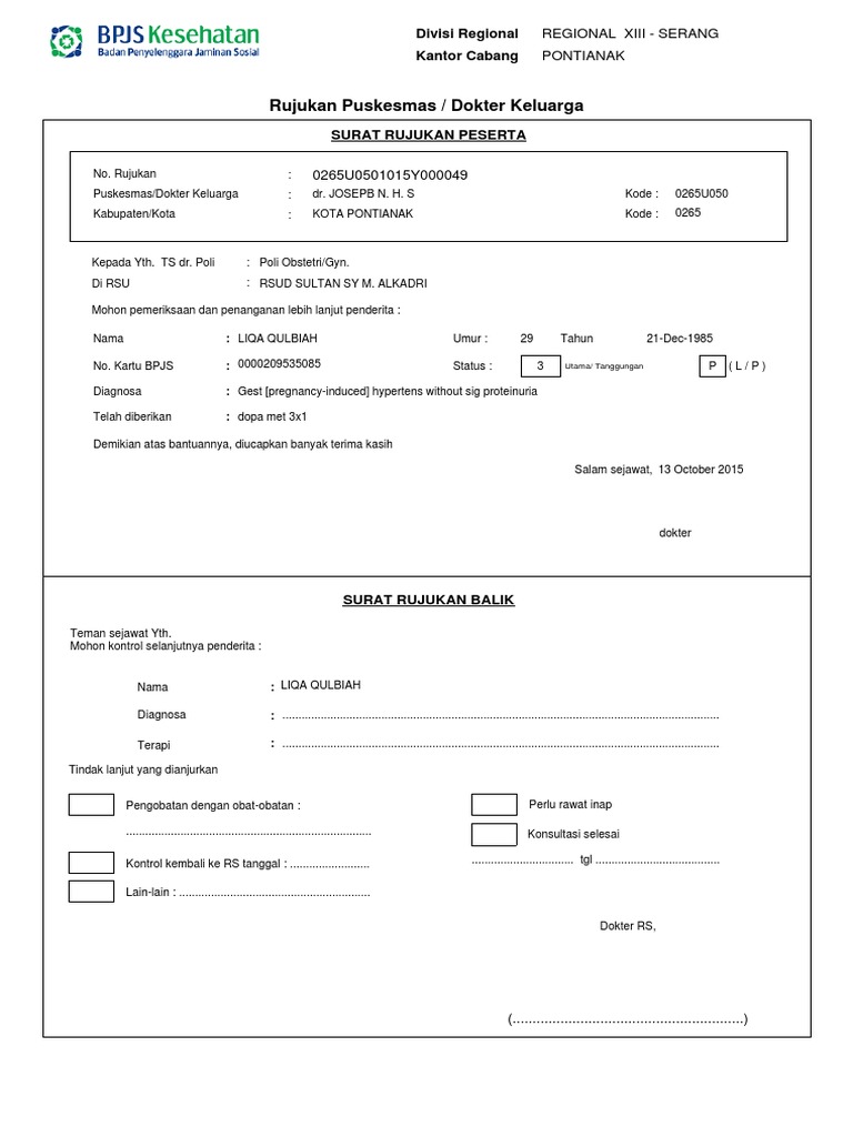 Contoh surat rujukan online bpjs. Apakah pasien bisa meminta surat rujukan dari faskes tingkat 1 puskesmas poliklinik. Contoh surat rujukan bpjs dari puskesmas ke rumah sakit. Bagi anda pengguna jaminan kesehatan dari badan penyelenggara jaminan sosial bpjs sangat penting hukumnya untuk memahami tata cara mendapatkan surat rujukan bpjs. Media online yang menyajikan informasi mengenai program pemerintah yaitu bpjs kesehatan dan bpjs ketenagakerjaan program yang bertujuan.
