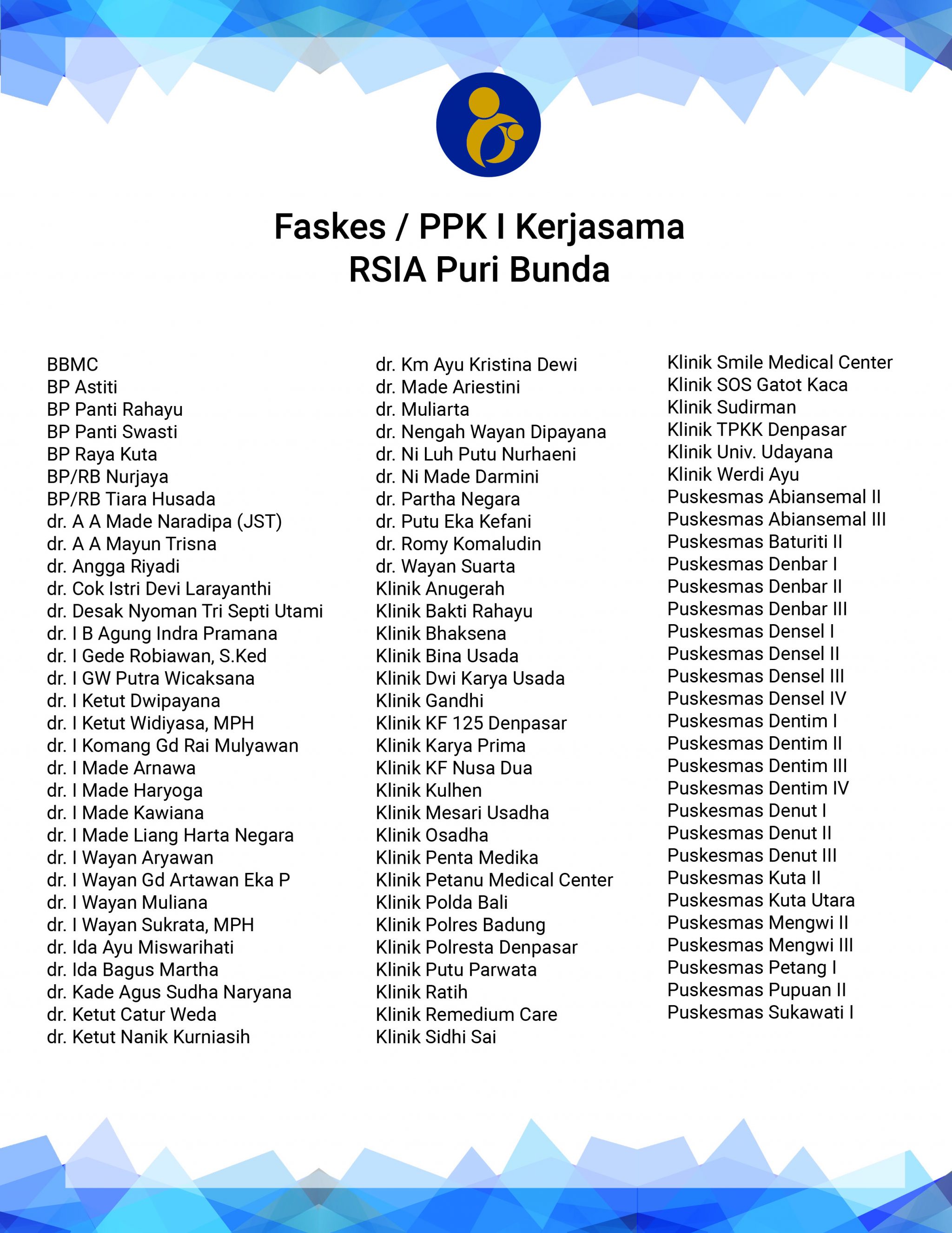 Faskes bpjs denpasar 2020. Bpjs kesehatan fasilitas kesehatan. Jakarta 08 09 2020 bank rakyat indonesia bri memberikan kemudahan bagi peserta program jaminan kesehatan nasional kartu indonesia sehat jkn kis khususnya peserta menunggak melalui program cicilan pembayaran tunggakan iuran melalui kartu kredit bri. Silakan tekan ctrl f pada keyboard bagi anda pengguna laptop pc dan manfaatkan fasilitas find untuk pengguna smartphone tablet. Daftar alamat dokter dan faskes bpjs kesehatan kota denpasar.