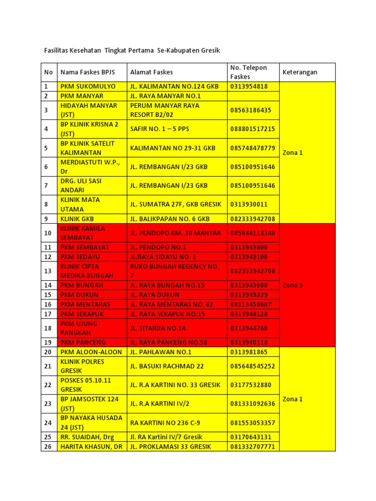 Faskes tingkat 2 bpjs gresik. Rembangan i 23 gkb gresik 3 1302u012 dpp roesmani sp dr jl pembangunan 2 perum pongahn 4 1302u017 dpp harita. Daftar alamat dokter dan faskes bpjs kesehatan kab gresik. K blog update oktober 2016 berikut ini saya bagikan daftar kode faskes bpjs dan alamat faskes bpjs tingkat i yang ada di wilayah regional vii surabaya kantor cabang surabaya yang meliputi 3 wilayah dati ii sbb. Di era bpjs saat ini anda pasti sering mendengar kata fasilitas kesehatan yang sering disingkat dengan faskes namun apakah anda tau apa itu fasilitas kesehatan atau faskes di bpjs sendiri sebenarnya faskes yang sering kita dengar dikategorikan menjadi beberapa kategori yaitu faskes tingkat 1 2 dan 3 bahkan untuk faskes tingkat 1 namanya tertera di kartu bpjs kesehatan milik anda.