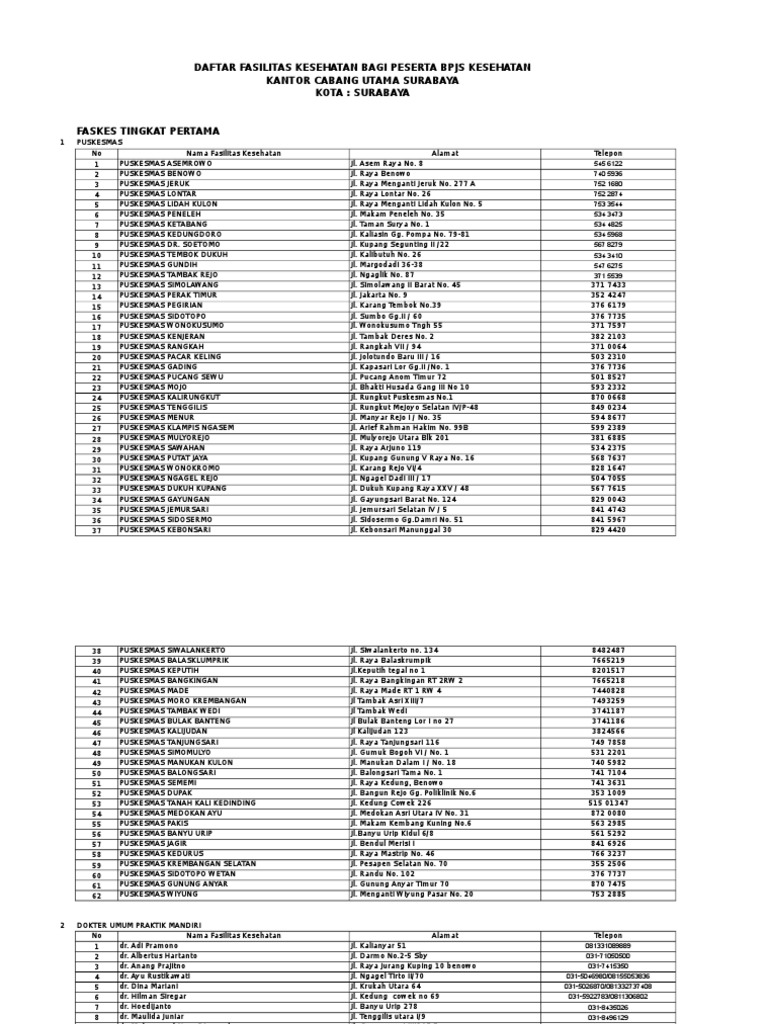 Kode dan alamat faskes tingkat 1 kota surabaya. Raya duduk sampeyan no 12 2 1302u009 dpp merdiastuti w p dr jl. Bpjs ini terbagi menjadi 2 yaitu bpjs kesehatan dan bpjs ketenagakerjaan. Fasilitas kesehatan tingkat 2 di tingkat ini untuk rujukannya memiliki sistem yang berjenjang dan biasanya memiliki dua tipe dari rumah sakitnya c dan b.