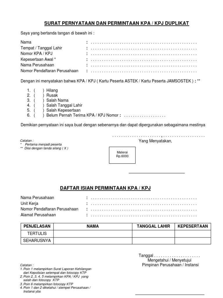 Lompat ke halaman. Asli kartu bpjs tk atau kpj jika hilang buat surat kehingan dan mengisi formulir duplikat kpj nanti akan diuraikan selengkapnya di bawah. Fotocopy dan asli ktp. Anda di halaman 1 dari 1.