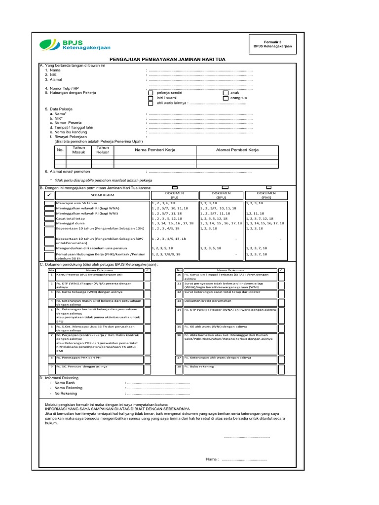 Formulir jaminan hari tua bpjs. Salah satu lembaga pembiayaan di indonesia yang hadir dengan menawarkan jaminan hari tua adalah bpjs atau badan penyelenggara jaminan sosial. Formulir 5 bpjs ketenagakerjaan a. Jaminan hari tua manfaat jht adalah berupa uang tunai yang besarnya merupakan nilai akumulasi iuran ditambah hasil pengembanganya. Formulir 5 digunakan untuk mengajukan klaim program jaminan hari tua download formulir 7 digunakan untuk mengajukan klaim program jaminan pensiun jp download formulir 7a digunakan untuk melaporkan data peserta dan susunan keluarga ahli.