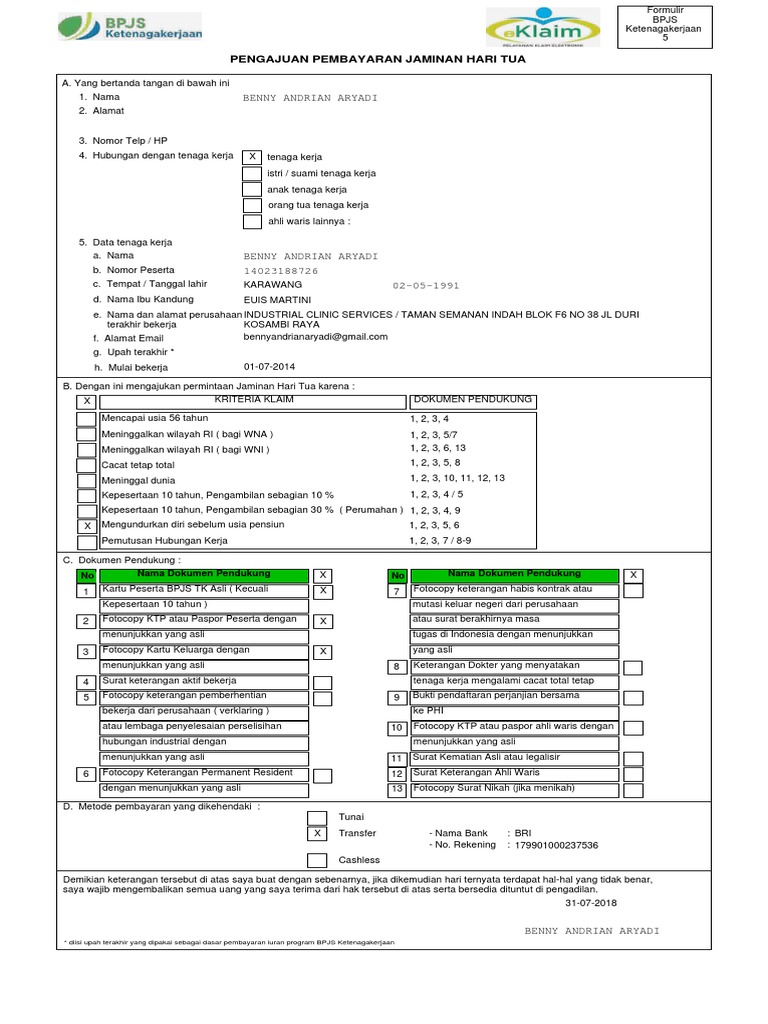 Yang bertanda tangan di bawah ini 1. Dengan memilih dan mendaftar pada layanan bpjs ketenagakerjaan anda akan bisa memperoleh jaminan hari tua yang tentunya akan menguntungkan anda karena masa pensiun anda akan terlewati dengan rasa bahagia dan menyenangkan. Untuk bpjs ketenagakerjaan sendiri adalah salah satu program jaminan sosial yang memberikan berbagai jenis jaminan dalam sistem jaminan sosial nasional seperti jaminan hari tua jaminan pensiun jaminan kecelakaan kerja dan jaminan kematian. Pengajuan pembayaran jaminan hari tua melalui pengisian formulir ini maka dengan ini saya menyatakan bahwa.