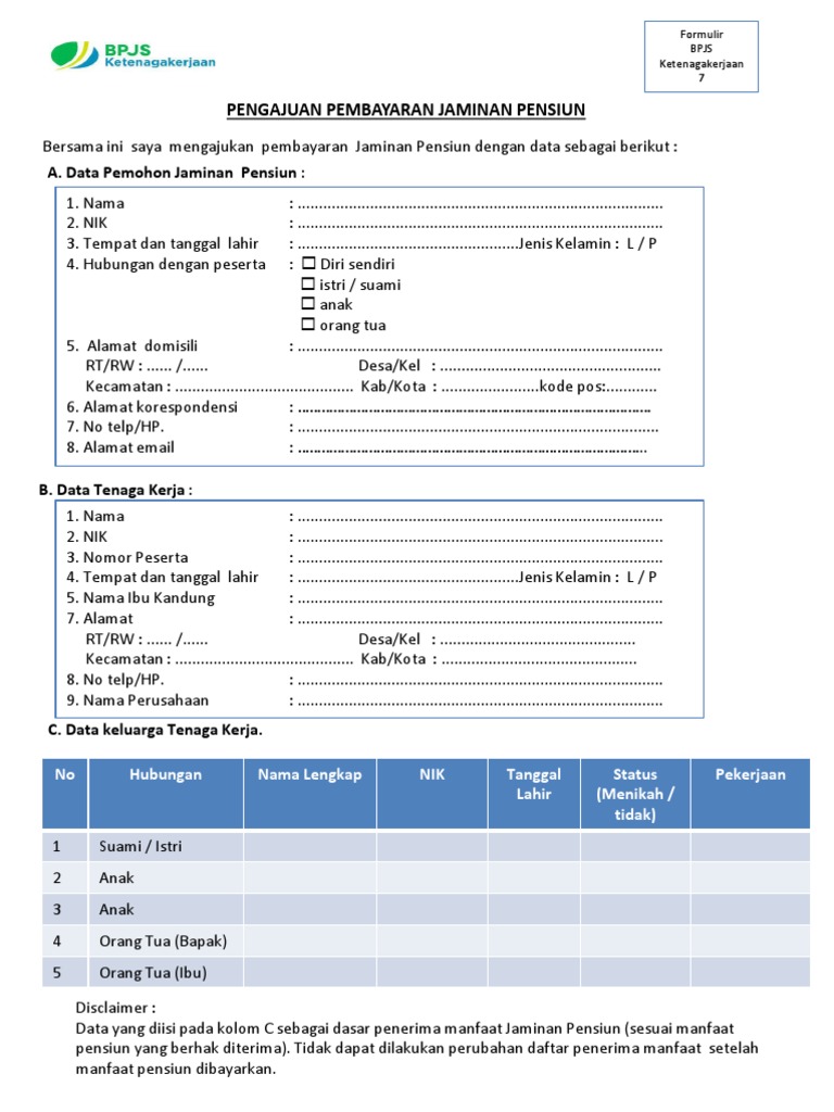 Jaminan hari tua jaminan pensiun peraturan undang undang peraturan pemerintah peraturan presiden keputusan presiden peraturan menteri peraturan bpjs ketenagakerjaan aplikasi perisai gn lingkaran e procurement mitra pusat layanan wbs. Formulir bpjs ketenagakerjaan 7 pengajuan pembayaran jaminan pensiun a. Jaminan pensiun jaminan pensiun adalah jaminan sosial yang bertujuan untuk mempertahankan derajat kehidupan yang layak bagi peserta dan atau ahli warisnya dengan memberikan penghasilan setelah peserta memasuki usia pensiun mengalami cacat. Formulir 5 digunakan untuk mengajukan klaim program jaminan hari tua download formulir 7 digunakan untuk mengajukan klaim program jaminan pensiun jp download formulir 7a digunakan untuk melaporkan data peserta dan susunan keluarga ahli.