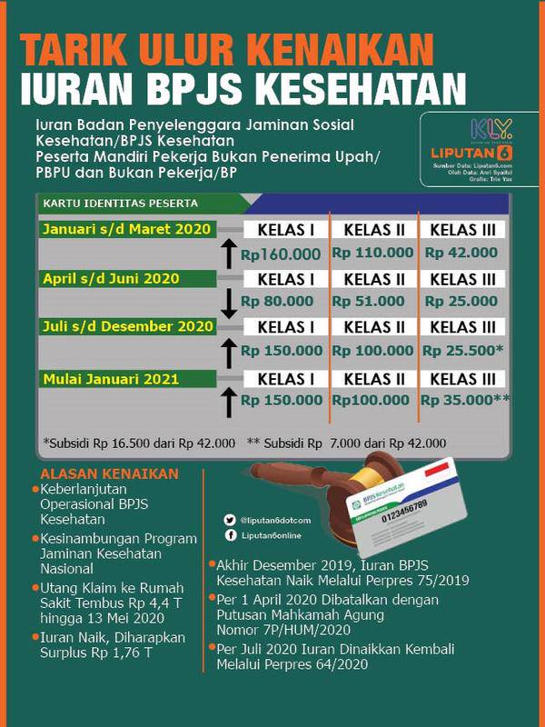Iuran bpjs kesehatan kelas 3 kembali naik menjadi rp42 ribu per bulan dahulu rp25 5 ribu. Sebelumnya wacana tersebut sempat dibatalkan oleh mahkamah agung ma yang tertuang dalam putusan mahkamah agung nomor 7 p hum 2020. 80 000 kelas 2 rp51 000 dan kelas 3 rp. Namun pemerintah memberikan subsidi sehingga peserta tetap membayar rp25 500 hingga desember 2020.