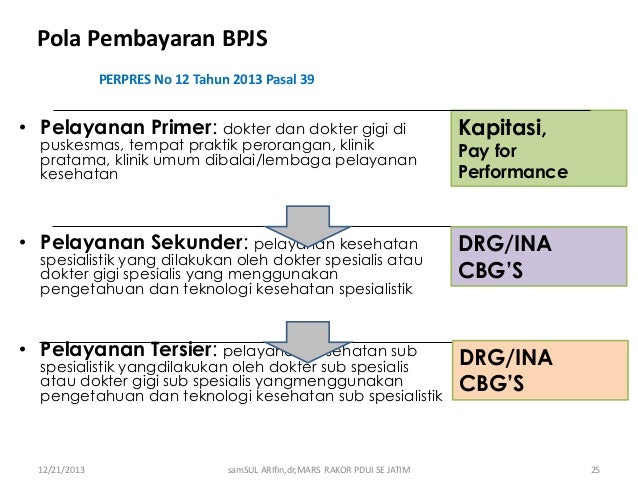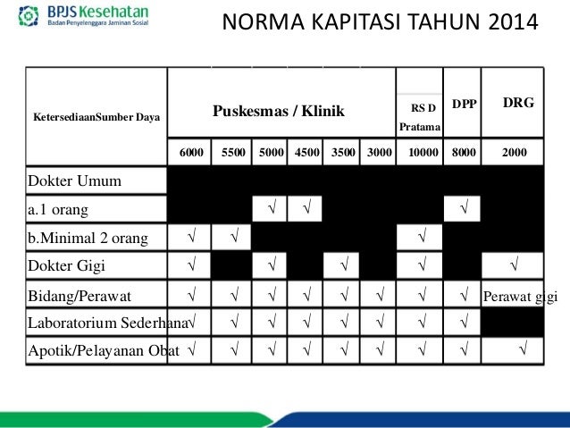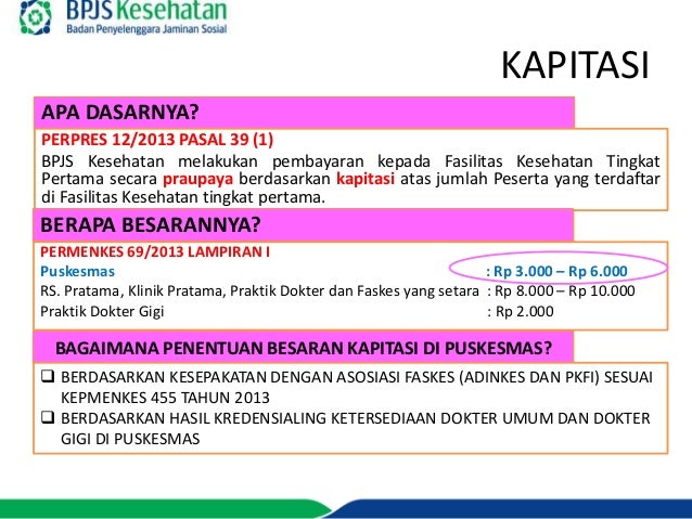 Bpjs kesehatan dan dinas kesehatan kabupaten kota yang dievaluasi paling lama setiap 3 tiga bulan. Perpres ini mengatur agar jasa dokter dan tenaga kesehatan lain serta dukungan operasional pelayanan dapat langsung digunakan di puskesmas non badan layanan umum daerah blud. Kompensasi yang diberikan untuk ppk i disebut kapitasi kapitasi adalah sejumlah uang. Sekedar ilustrasi bila dokter fktp dengan kapitasi rp 10 000 dan jumlah peserta 1000 maka dari bpjs akan menerima dana kapitasi rp10 000 000 atau 10 juta rupiah.