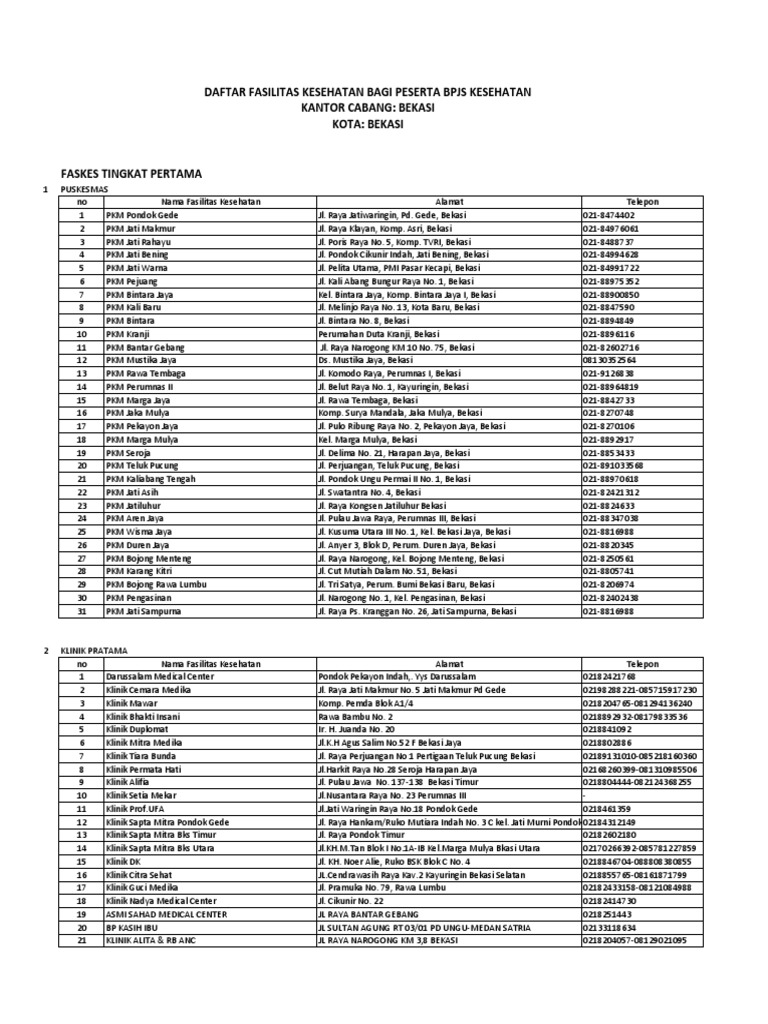 Kota bekasi mempunyai beberapa faskes tingkat 1 klinik dan puskesmas yang tersebar di beberapa kecamatan di daerah bekasi seperti kecamatan bantar gebang bekasi barat bekasi selatan bekasi timur bekasi utara jatiasih jatisampurna medan satria mustika jaya pondok gede pondok melati dan kecamatan rawalumbu. Silahkan datang pada jam kerja atau jam operasional yang berlaku yaitu kantor bpjs kesehatan yang ada di cikarang buka dari jam 08 00 sampai jam 15 00 senin sampai jumat. Jl raya no 3 babelan kota. Ruko cikarang central city blok f 06 jl.