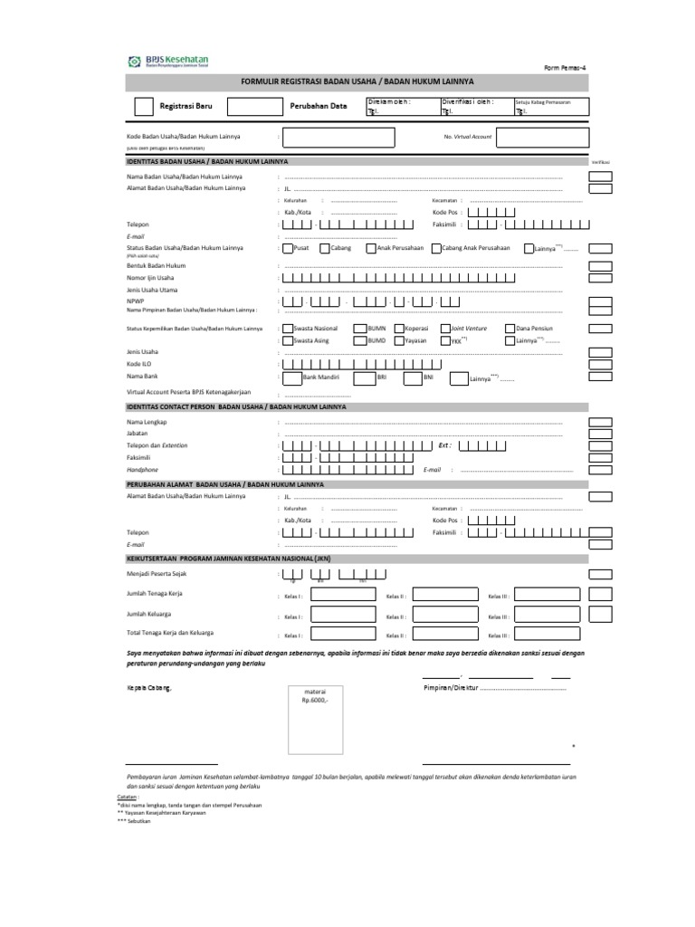 Kode badan usaha bpjs kesehatan. Apabila tanggal 10 jatuh pada hari libur maka pembayaran dapat dilakukan pada hari berikutnya. Identitas badan usaha asosiasi kolom bpjs ketenagakerjaan kode pos kabupaten kota kode pos kabupaten kota ext. Undang undang nomor 40 tahun 2004 tentang sistem jaminan sosial nasional 3. Bpjs kesehatan dapat mengubah syarat dan ketentuan penggunaan portal pendaftaran ini yang akan berlaku bagi seluruh pengguna portal pendaftaran badan usaha badan hukum lainnya bpjs kesehatan.