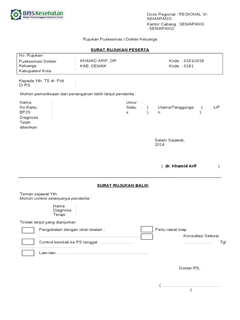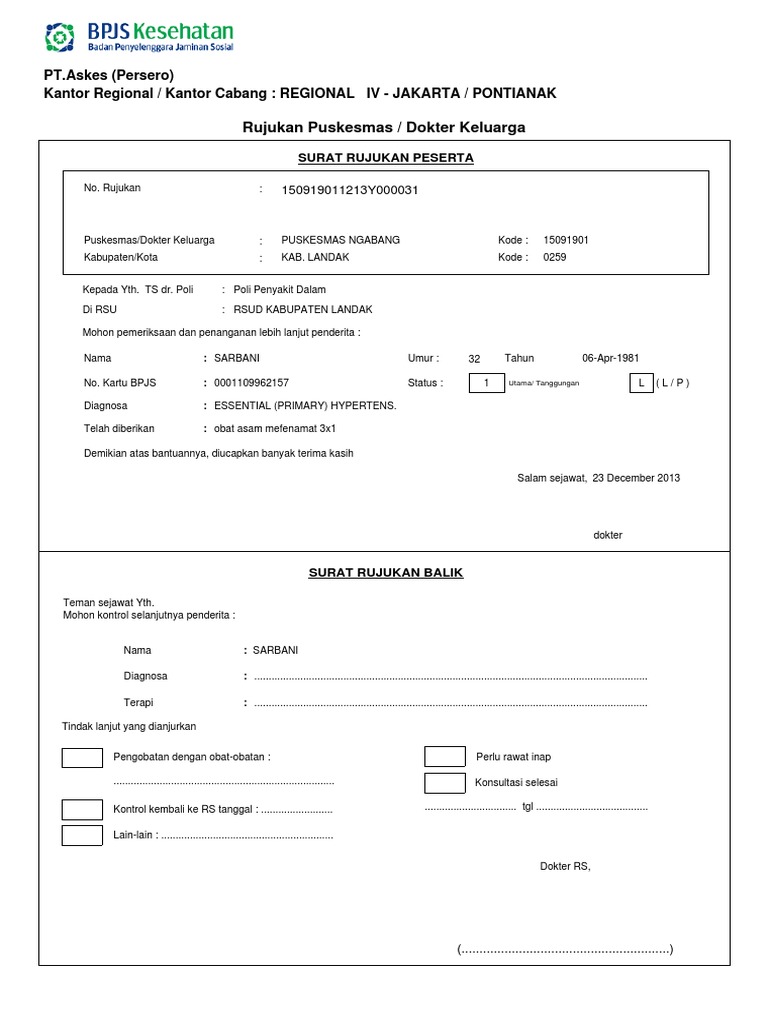 Surat rujukan bpjs merupakan surat yang diberikan oleh pihak atau petugas dari fasilitas kesehatan kelas satu seperti puskesmas klinik dan sejenisnya kepada pasien peserta bpjs dikarenakan sarana dan prasarana yang dimiliki faskes tersebut kurang memadai untuk menangani pasien dan mengharuskan dirawat di fasilitas kesehatan kelas dua atau fasilitas kesehatan tingkat lanjutan. Share tweet 1 share. Share tweet 1 share. Surat rujukan bpjs bisa dipakai berapa kali ya.